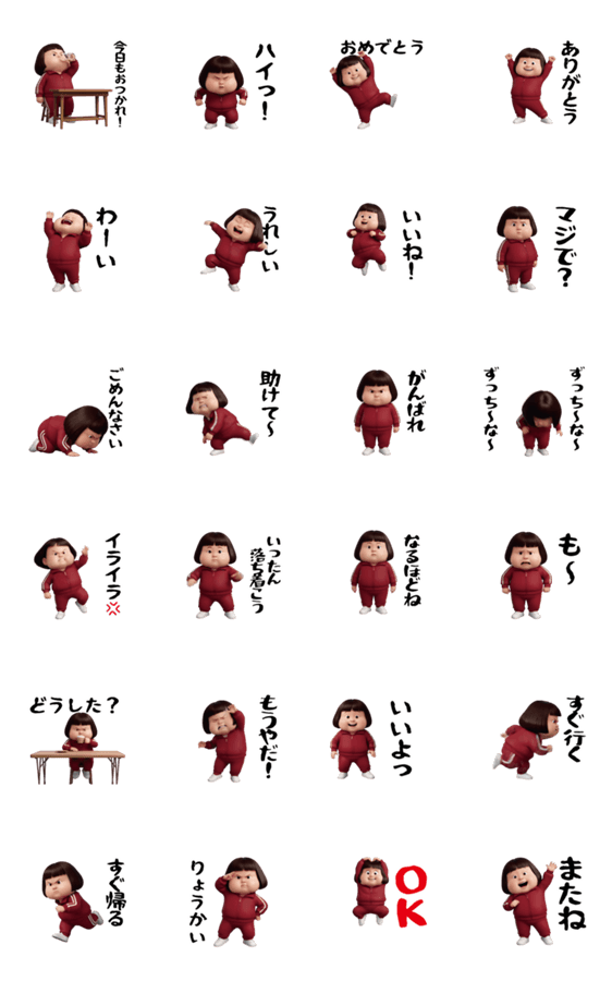 | スタンプ説明 | パッと見ダサいけど、昭和味があってかわいいスタンプ(芋ジャージ24)自分で使ってもよし、プレゼントしてもよし。24は無難な言葉です |