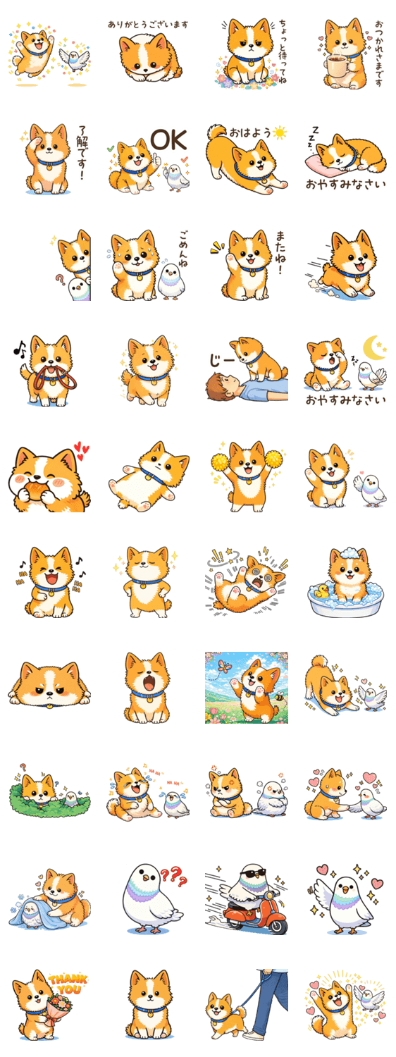 犬のおいなりと鳩のぴーたんのほのぼのスタンプです。