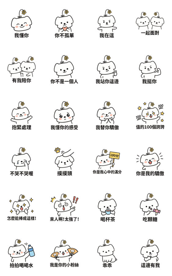 | スタンプ説明 | Quiet and gentle, Little Flower Dog stays by your side. Perfect for sharing comfort, encouragement, and soft cheer-ups during tired or low moments. |
