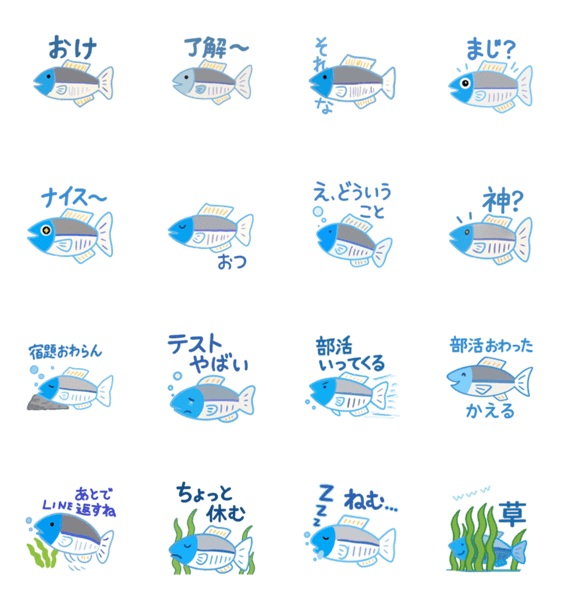 | スタンプ説明 | ひとこと返事や連絡ごとなどを、魚が目を点にしたり、ヒレを広げたりして伝える日常のやりとりにぴったりなスタンプです。部活いってくるがあるから学生用としておススメ。 |