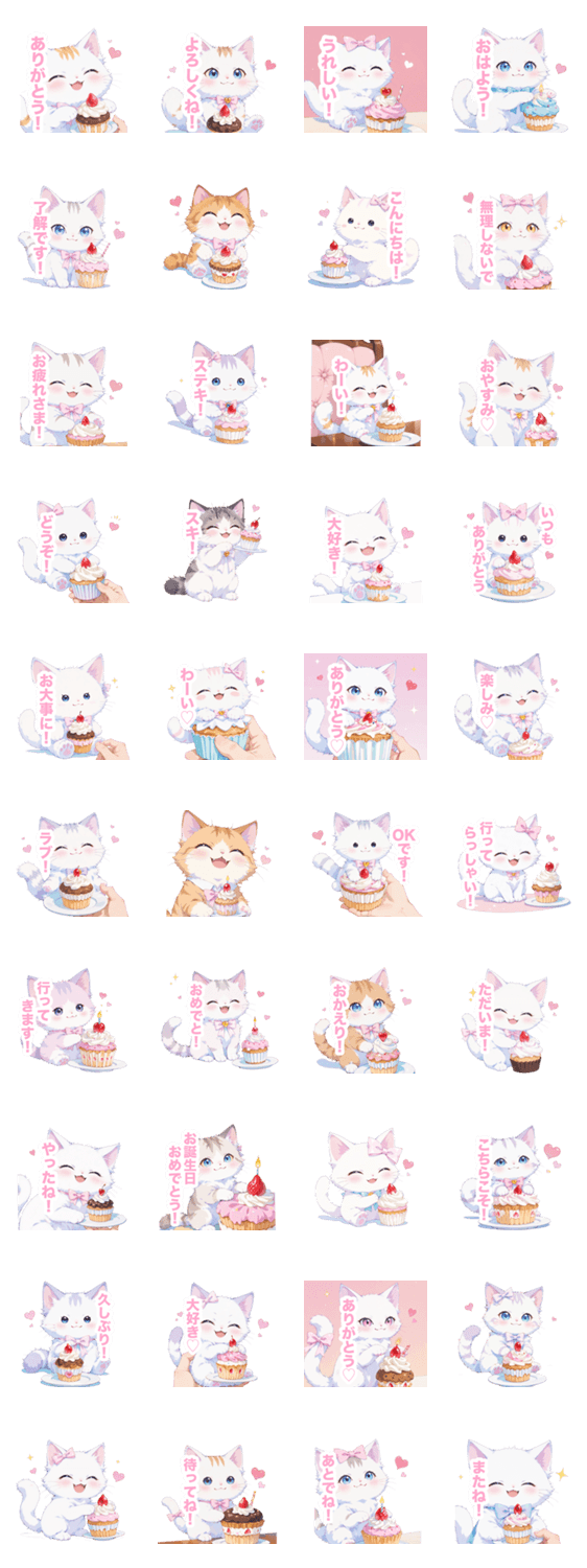 | スタンプ説明 | 日常的なセリフ付きです。かわいい/可愛い/癒し/日常/挨拶/毎日使える/ねこ/猫/ネコ/ピンク/ハート/白猫/白ねこ/スイーツ/ケーキ/おやつ/甘い/カップケーキ/ふわふわ |