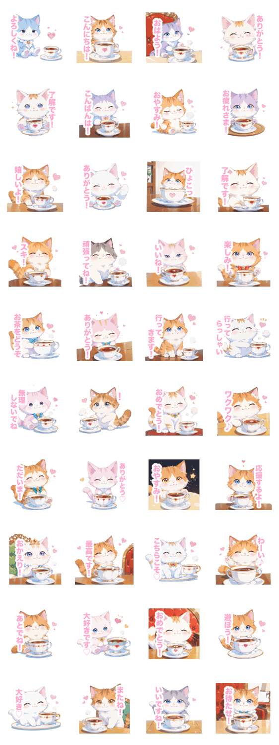 | スタンプ説明 | 日常的なセリフ付きです。かわいい/可愛い/癒し/日常/挨拶/毎日使える/猫/ネコ/ピンク/ハート/カフェ/紅茶/ティータイム/アフタヌーンティー/スコティッシュフォールド |