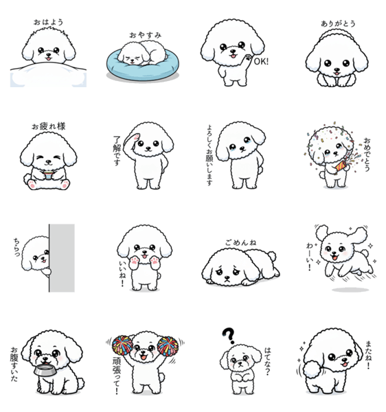| スタンプ説明 | 真っ白でふわふわなビションフリーゼの日常スタンプです。まるでお菓子のような愛くるしい姿と豊かな表情が満載!毎日のトークを、癒やしと笑顔でハッピーに彩ります。 |