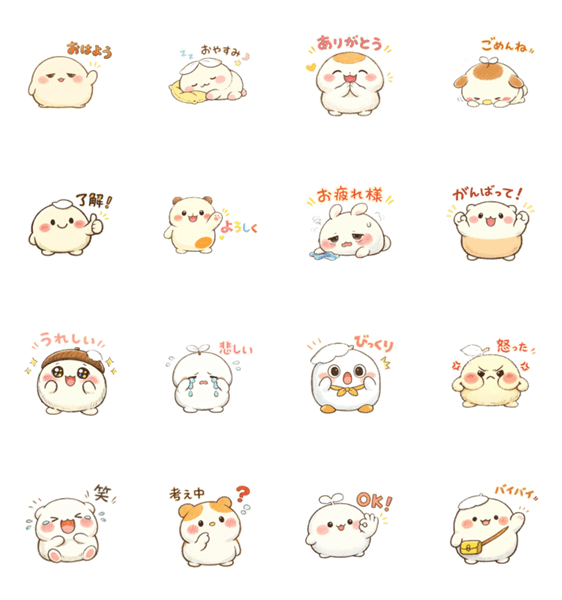 | スタンプ説明 | 丸くて柔らかそうな「もちもちくん」が登場!温かみのある手書きイラストと日常で使いやすいメッセージのセットです。 |