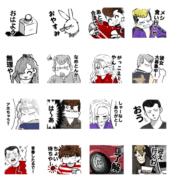 昭和80年代の不良スタンプ。 関西弁の軽快なセリフと、強さと懐かしさを感じる日本のレトロな雰囲気。