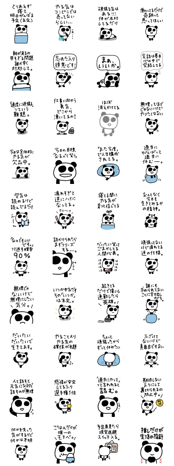 | スタンプ説明 | BIGに伝える!私の名前はパンダです。 もっとゆっくりいきましょう。 子供の落書きのようなゆるいスタンプです。 シンプル/ゆる/シュール/パンダ/無気力/あいさつ ※このスタンプはトークルームで大きく表示されるBIGスタンプです。 |