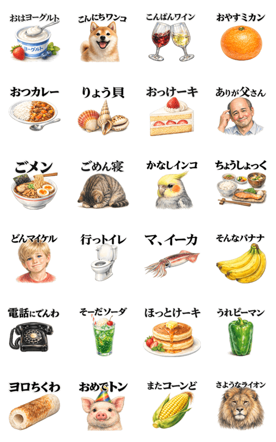 | スタンプ説明 | 飛び出す駄洒落のスタンプ。うごく/動く/挨拶/基本/ポップアップ/だじゃれ/死語/実写/写真/リアル/面白い/ネタ/動く/山田まぽん作 |