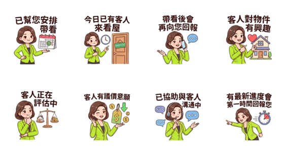 | スタンプ説明 | Useful stickers for sharing sales progress and viewing updates. Ideal for communicating with sellers and buyers during negotiations. |