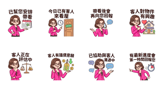 | スタンプ説明 | Useful stickers for sharing sales progress and viewing updates. Ideal for communicating with sellers and buyers during negotiations. |