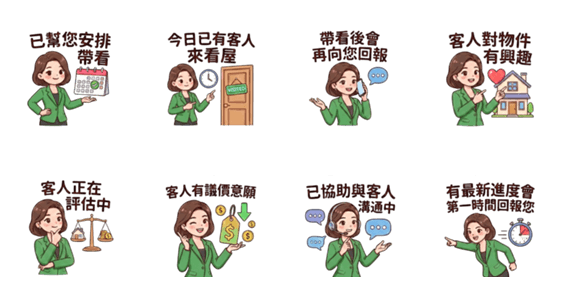 | スタンプ説明 | Useful stickers for sharing sales progress and viewing updates. Ideal for communicating with sellers and buyers during negotiations. |