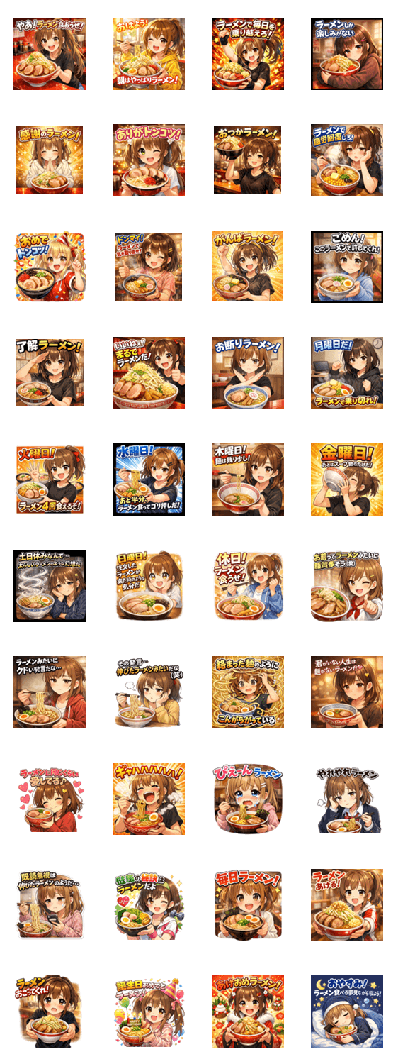 | スタンプ説明 | 一年中毎日一週間通して使えるラーメン娘です。拉麺、らーめん、チャーシュー、飯テロ、美少女、萌え、面白い、社畜、社会人、仕事、曜日ネタ、ダジャレ、毒舌、ギャグ。 |