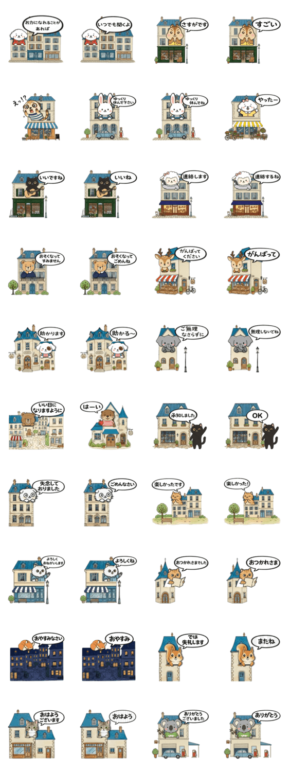 | スタンプ説明 | ヨーロッパの古い街並みを舞台にした大人可愛いスタンプです。一冊の絵本をめくっているような、優しくて温かい世界観。丁寧な敬語から、日常で使いやすい挨拶まで。 |