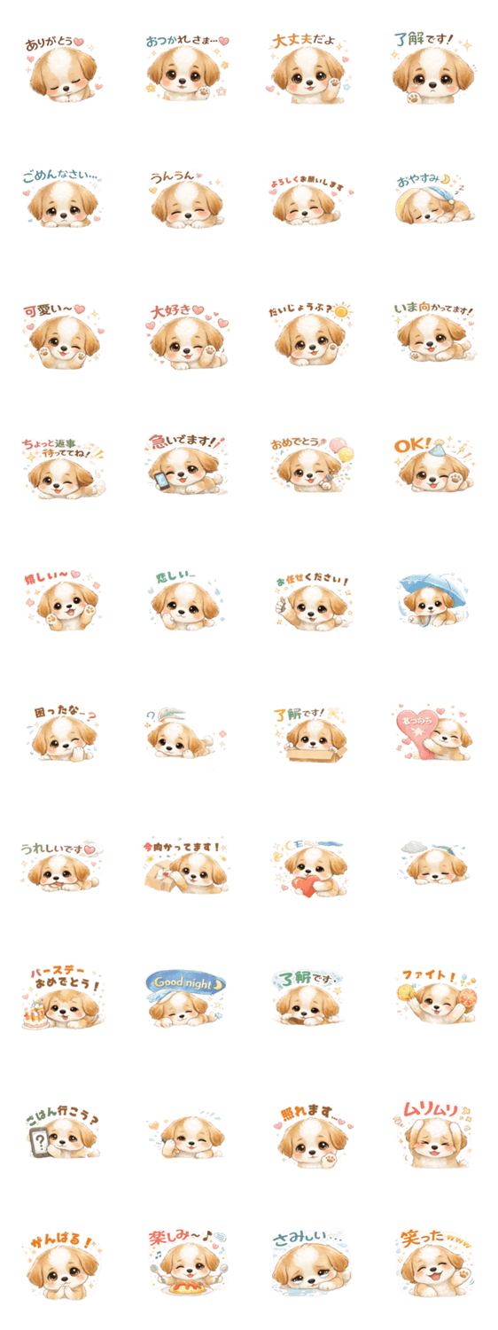 | スタンプ説明 | Cute dog stickers that gently share your feelings. Perfect for thanks, sorry, and everyday messages to loved ones. |