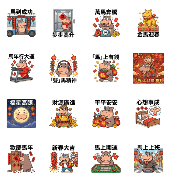 | スタンプ説明 | Classic New Year wishes with a twist. A clumsy hippo celebrating his zodiac year, laughing through work, life, and everyday struggles. |
