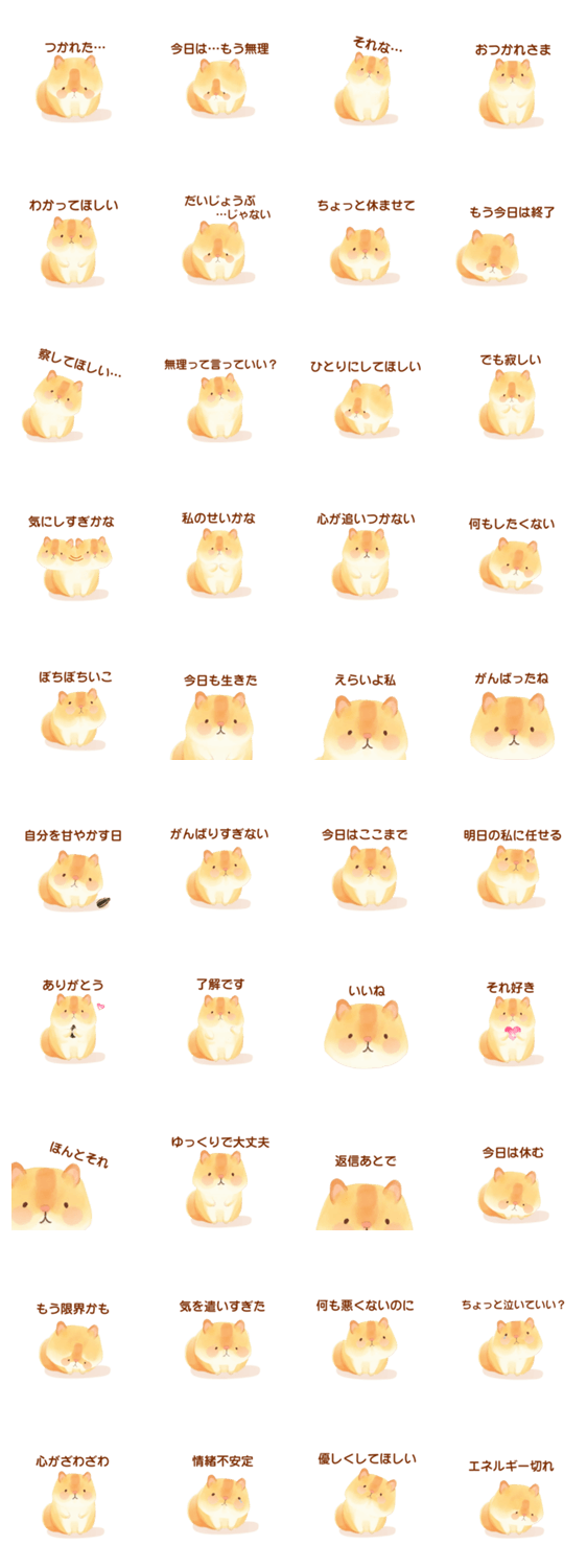 | スタンプ説明 | しんどい日も、元気な日も。 気持ちを代わりに伝えてくれるハムスターです。 「無理」「察してほしい」 そんな本音を、やさしく共感。 毎日使いやすい共感ワードたっぷり。 |