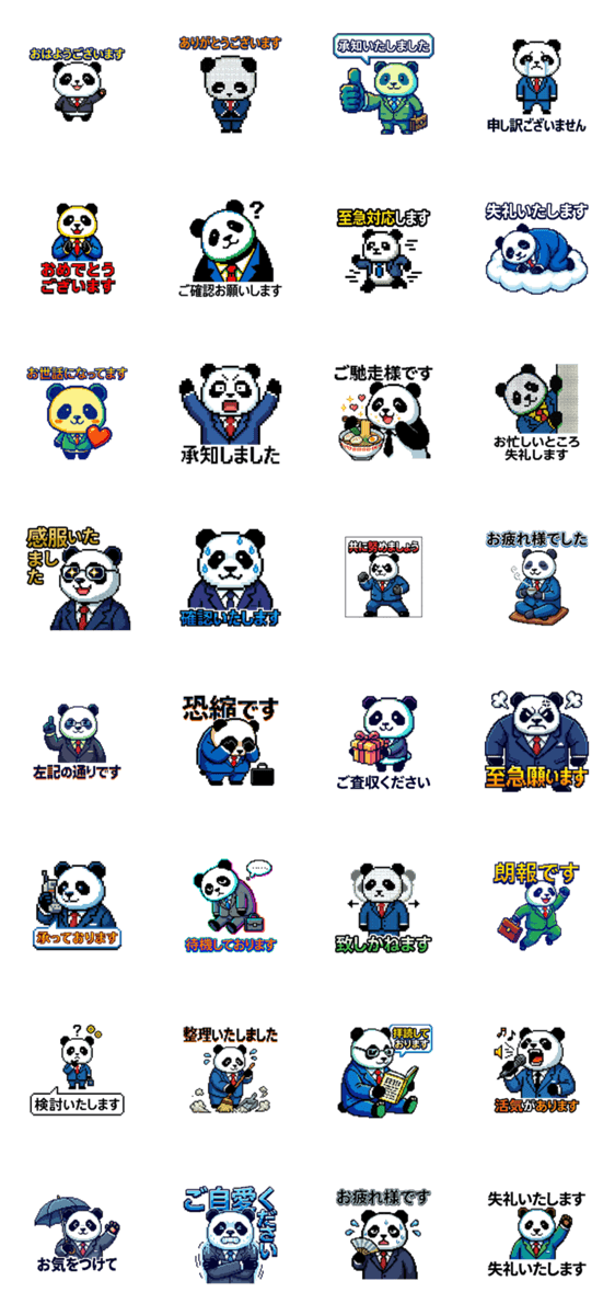 ビジネスシチュエーションで使える、可愛いけどフォーマルなパンダスタンプ。会社の仲間とのコミュニケーションに最適。