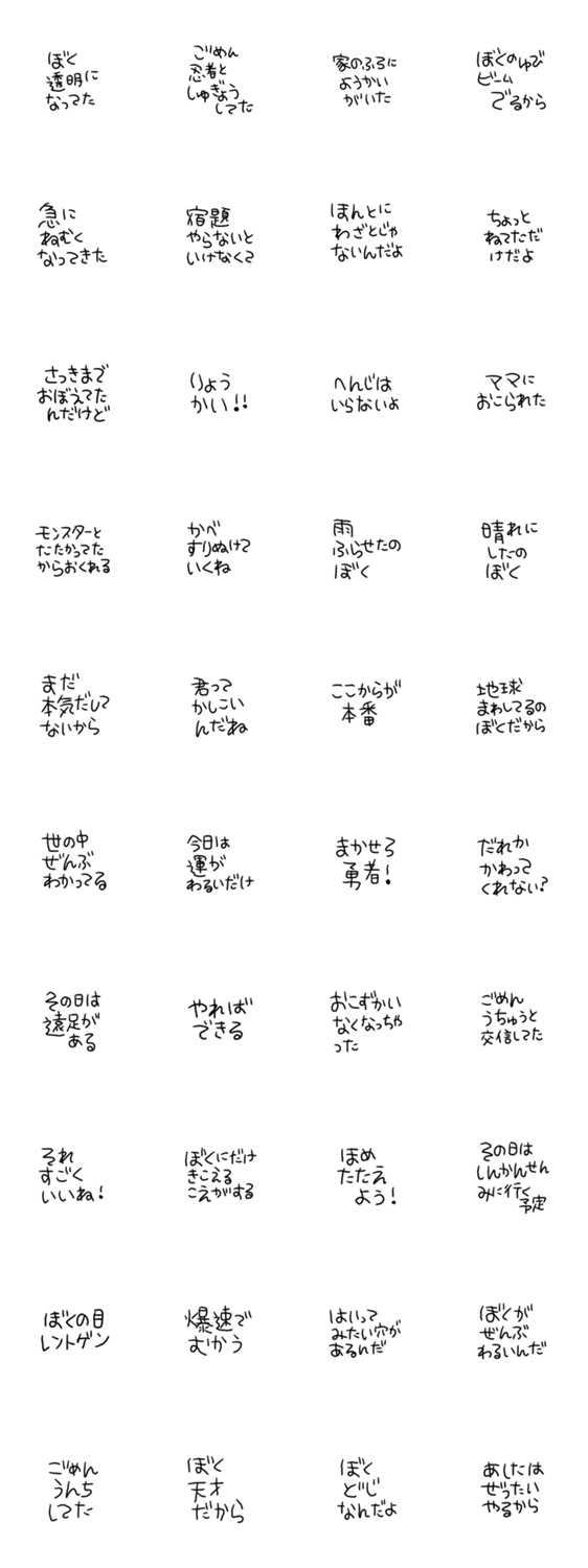 | スタンプ説明 | 世の中のこと何でも知ってるし何でも出来るんだ。 #男の子#お父さん#パパ#親子#幼稚園#保育園#おちゃめ#不思議#やんちゃ#こどもですが何か#ジョーク#冗談#男友達#おもしろ |