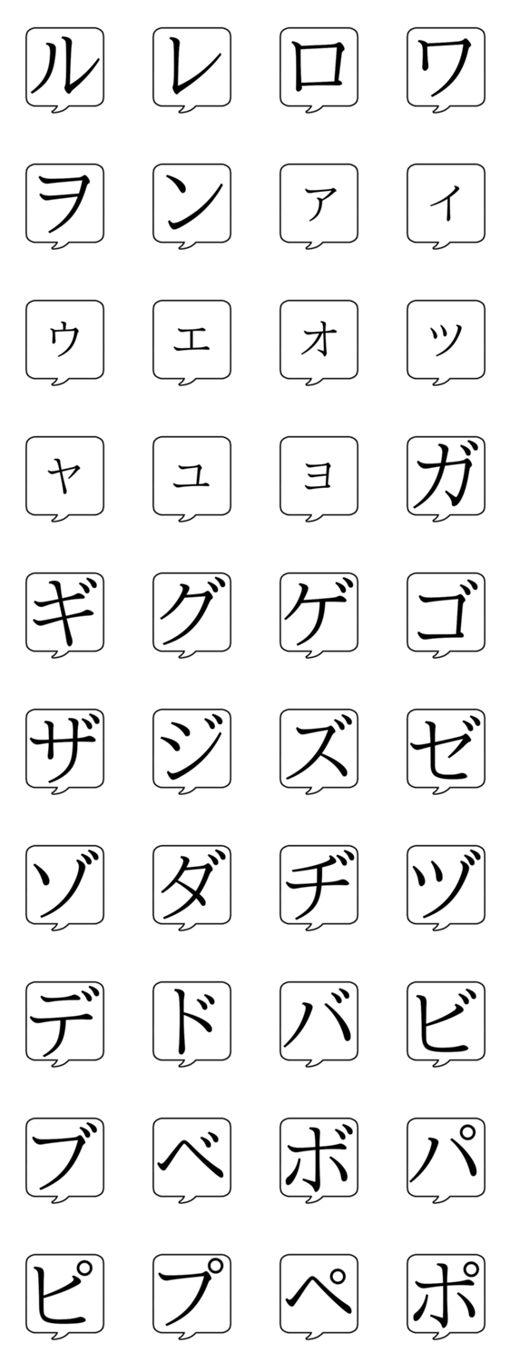 | スタンプ説明 | ル~ポまでの片仮名スタンプです。50音順/一文字の吹き出し/ルレロ・ワヲン・ァィゥェォ・ッ・ャュョ・ガギグゲゴ・ザジズゼゾ・ダヂヅデド・バビブベボ・パピプペポ |