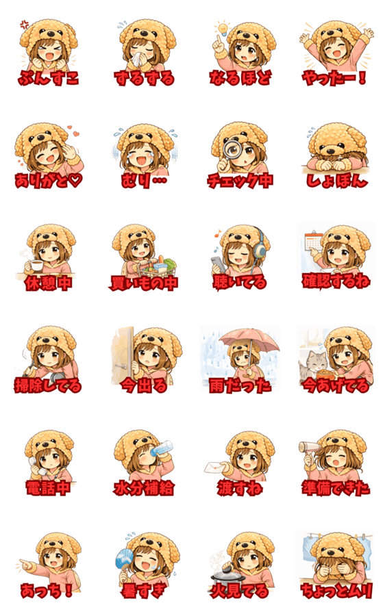 | スタンプ説明 | もこもこ犬フードをかぶった女の子の、毎日使えるゆるかわスタンプ第2弾。 よく使うあいさつ・行動・リアクションをさらに追加して、これだけで会話がもっと回ります。 |