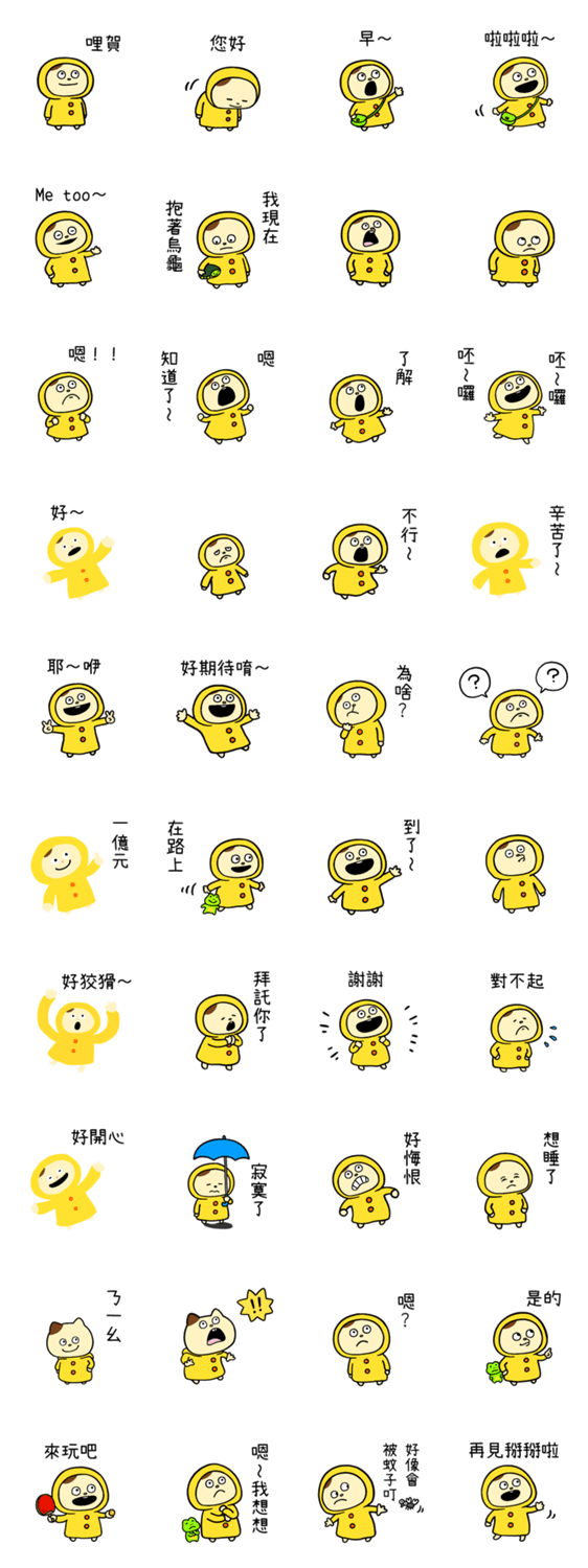 | スタンプ説明 | It always wears its raincoat, but when it gets too hot and stuffy, it secretly takes it off. Release date in Japan:June 7, 2018 |