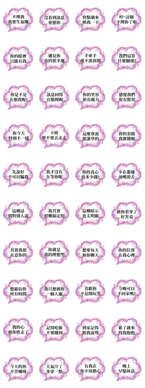 | スタンプ説明 | 思わず反応しちゃう挑発フレーズ集。恋の温度が一気に上がる! |