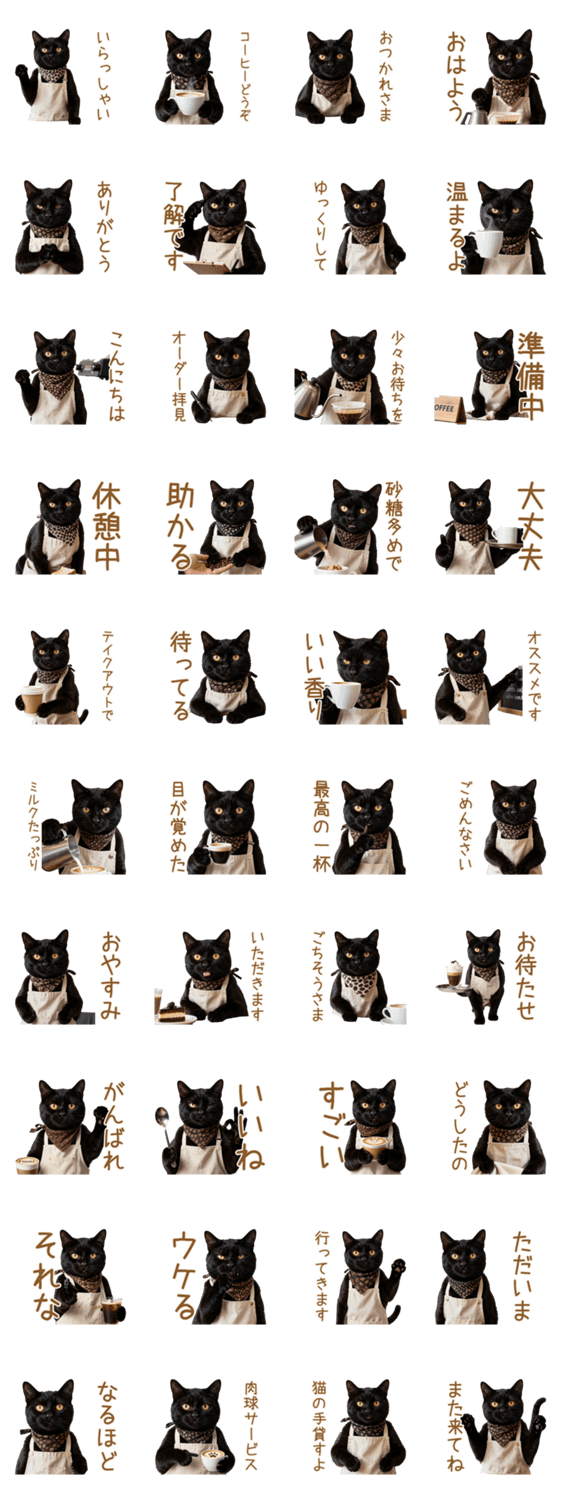 | スタンプ説明 | バリスタ黒猫のカフェタイム!コーヒー好き/大人/仕事/挨拶/お洒落/シンプル/スイーツ/猫の日/日常/敬語/丁寧/癒し/可愛い |