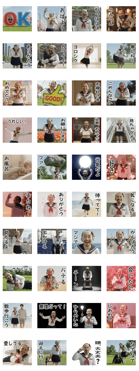 | スタンプ説明 | 中年おじさんのキモカワ面白スタンプ♪送信先の友達や相手が爆笑間違いなし!ギャグ/笑い/うける/セーラー服/ハゲ/ヒゲ/キモイ/エモい/おやじ/JK |