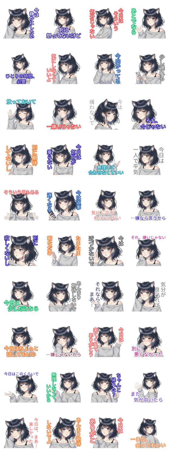| スタンプ説明 | 気分屋でマイペースな猫系女子の日常スタンプ。ひとりの時間を大切にするけれど、 心を許した相手には不器用に甘えるツンデレな一面も。 |