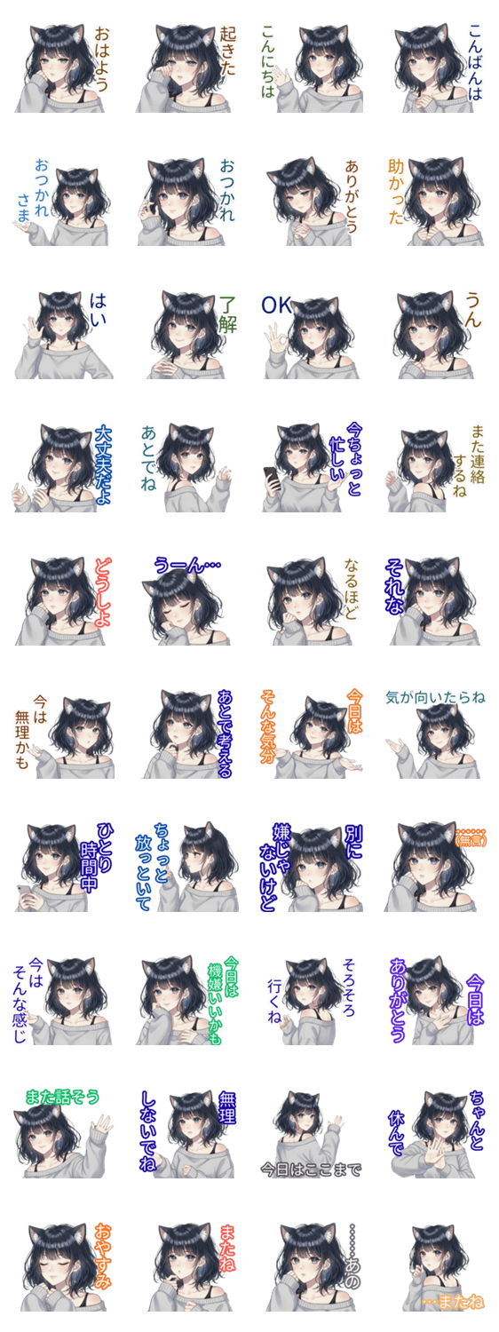 | スタンプ説明 | 気分屋でマイペースな猫系女子の日常スタンプ。ひとりの時間を大切にするけれど、 心を許した相手には不器用に甘えるツンデレな一面も。 |