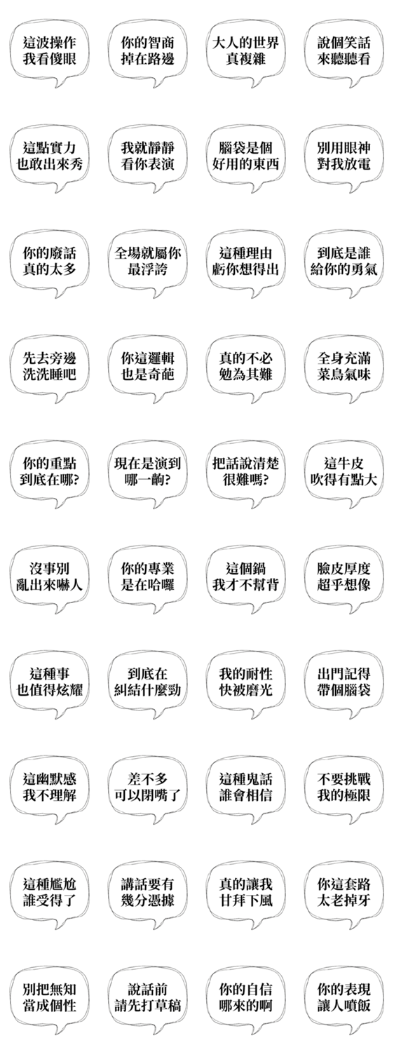 | スタンプ説明 | 悪口なしでプロ級のツッコミ!ユーモアでグループを支配しよう。友達同士のいじり合いに最適な台湾スタンプです。 |