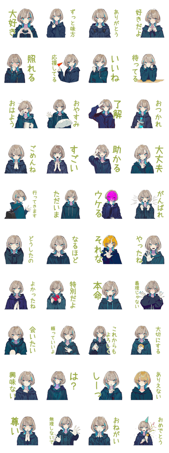 | スタンプ説明 | 気持ちを伝えるクールな女の子。日常/挨拶/毎日/使える/大人/シンプル/かわいい/恋人/友達/家族/推し/サブカル/ダウナー/女子/カップル/応援 |