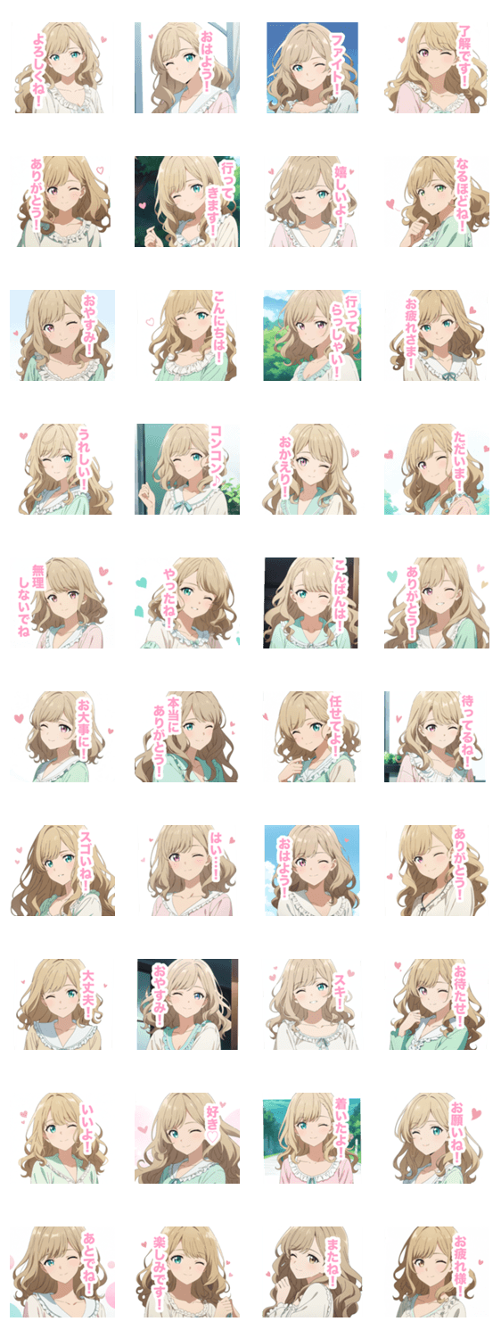 | スタンプ説明 | 日常的なセリフ付きです。アニメ/大人可愛い/ベージュ/女の子/女子/美少女/かわいい/可愛い/毎日使える/挨拶/会話/ふんわり/甘い/彼女/恋人/気遣い/癒し/お姉さん/笑顔 |
