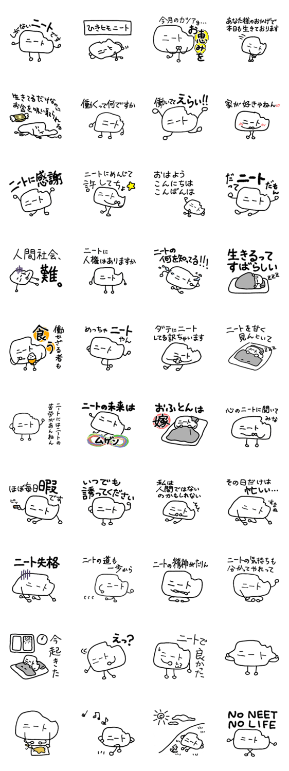| スタンプ説明 | ヒモニートが使いやすいスタンプです。 「ぼえニートくん」です。 たまに関西弁を話します。 にーと/ひも/無職/日常 |