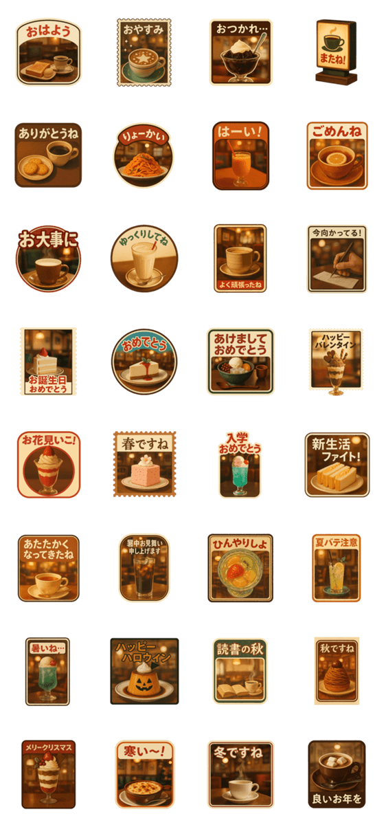 | スタンプ説明 | レトロな純喫茶の背景に、コーヒーやたまごサンド、メロンソーダ、ナポリタンなどの定番メニューを添え、一年中使える挨拶をまとめました。家族/友達/恋人/昭和/癒し |