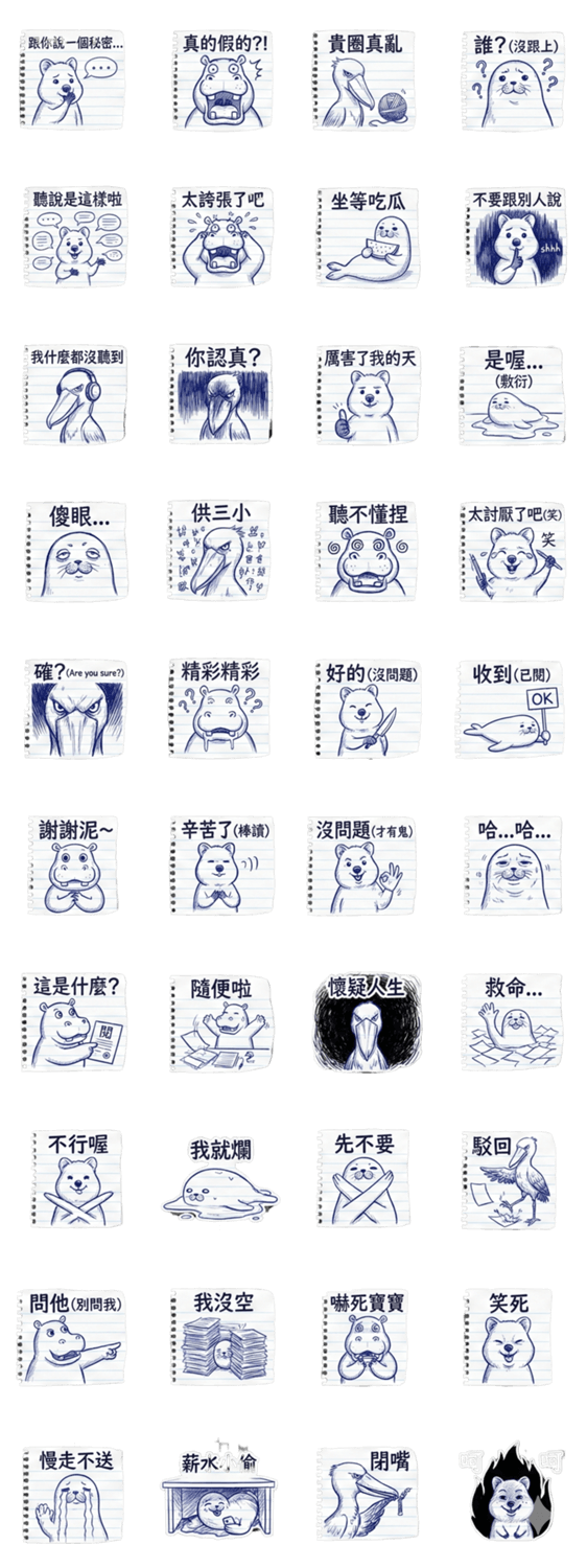 | スタンプ説明 | Survive the corporate jungle with our messy pen doodles! From the "Fake Smile" Quokka to the "Dead-eyed" Shoebill |