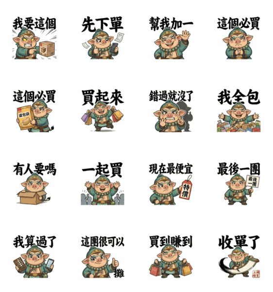 | スタンプ説明 | Masked Bajie takes on group buys and big shopping moments. Powerful brush-calligraphy phrases for ordering, deals, and buying together in daily chats. |