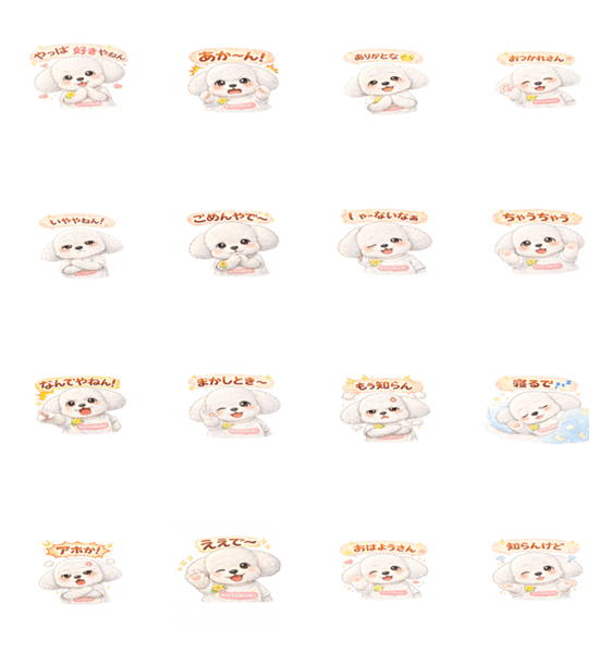 | スタンプ説明 | もこもこ犬の関西弁ステッカーです。日常会話で使いやすく、優しくてちょっと笑えるスタンプが揃ってます。 |