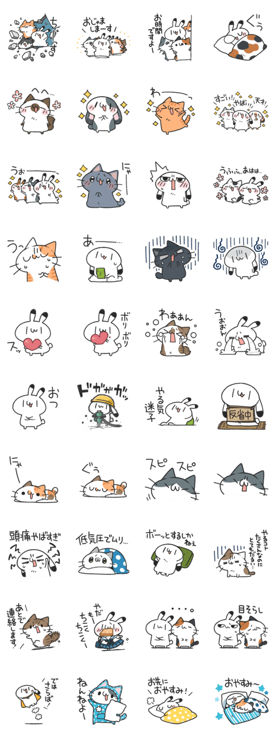 | スタンプ説明 | 日常にも仕事にも恋愛にもなんでも使えるシンプルなうさぎのスタンプ…なのを心がけていますがいつも少々荒ぶってしまいます!今回は猫も一緒に可愛がってあげてください! |