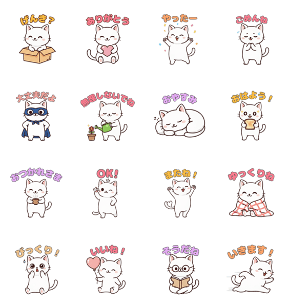 | スタンプ説明 | This cute white cat heals your loved ones! It melts stress and makes chats warmer. Perfect for after-work to share your kindness and peaceful vibes. |