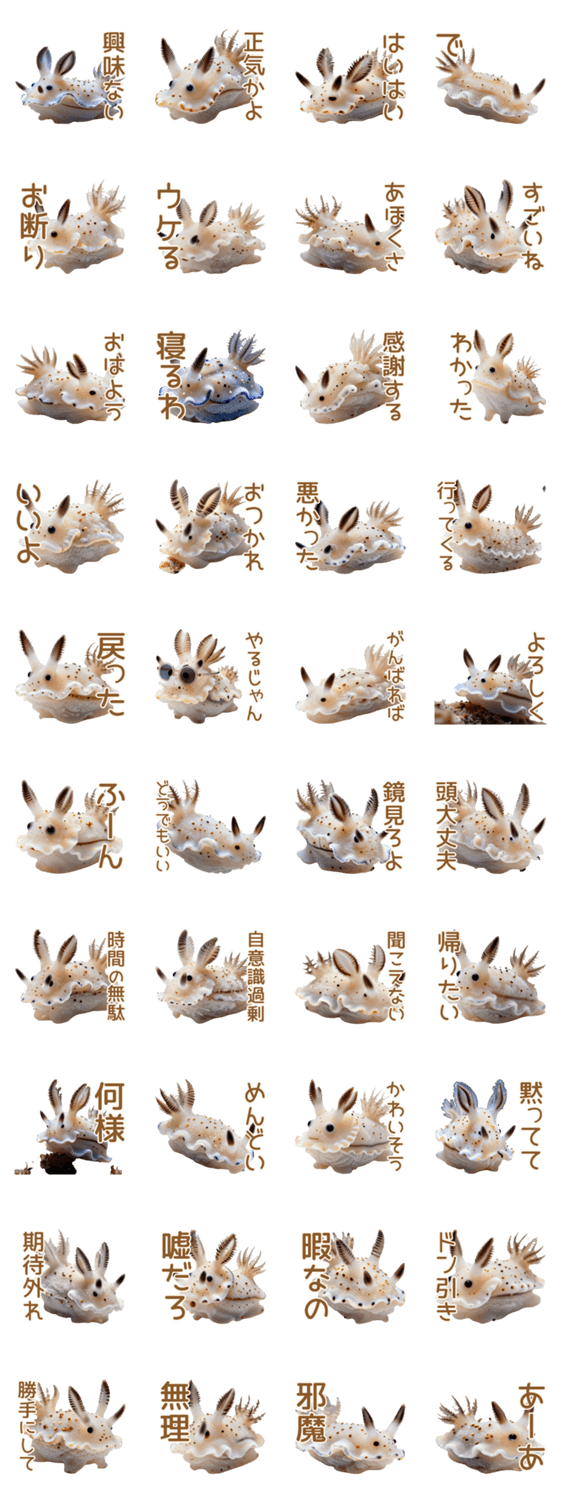 | スタンプ説明 | ふわふわで口が悪いゴマフビロードウミウシ。海のうさぎ/毒舌/煽り/本音/シュール/日常/挨拶/かわいい/面白い/ネタ/友達/ウミウシ/返信 |