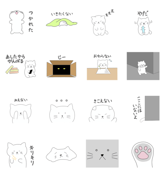 やる気のない気持ちをねこが代弁してくれるスタンプです。