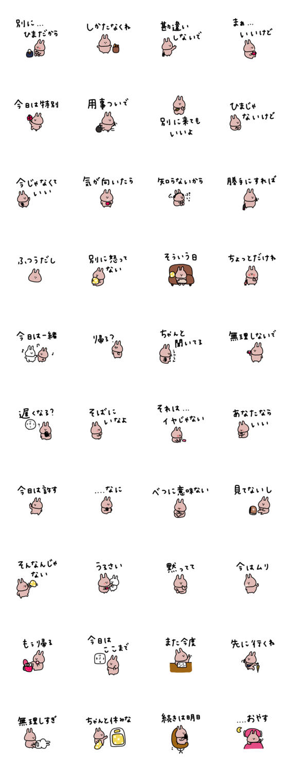 | スタンプ説明 | 時々うさぎのうさぎだけ。白たまに。ツン多め、でもちょっとデレ。恋してるスタンプ第二弾。 |