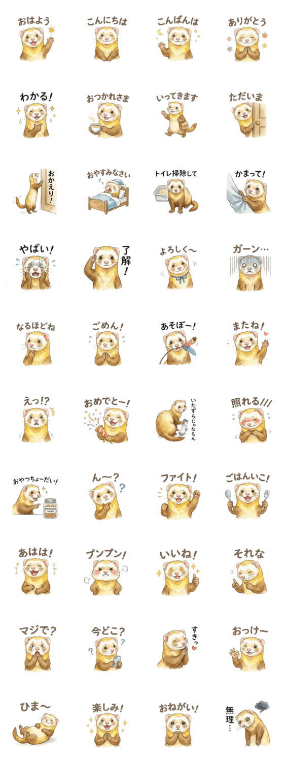 | スタンプ説明 | フェレット / バタースコッチ / ペット / イタチ / おこじょ / 万能 / 使える / 癒し / 気軽に使える / かわいい / 挨拶 / 友達 / 家族 / 学校 /日常 / |