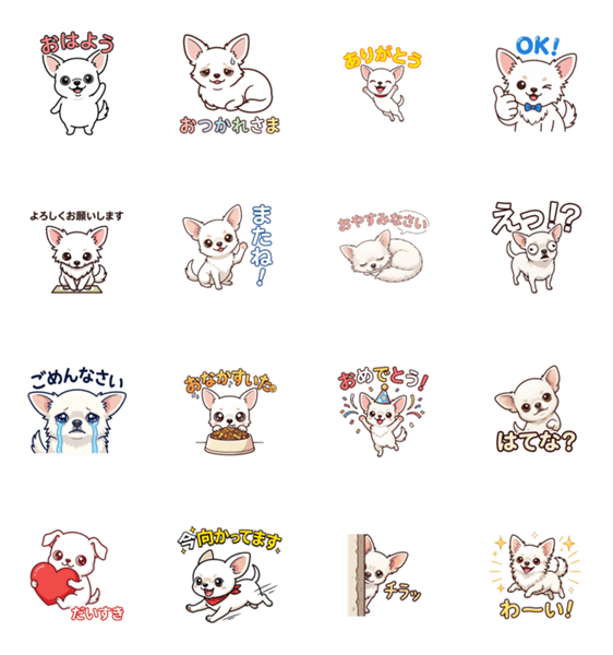 | スタンプ説明 | 16 cute stickers of a fluffy white chihuahua! Perfect for daily chats with family and friends. |