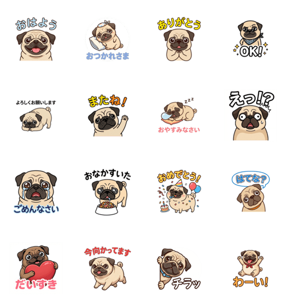 | スタンプ説明 | 16 cute stickers of a charming pug! Express your daily feelings with this wrinkly friend. |