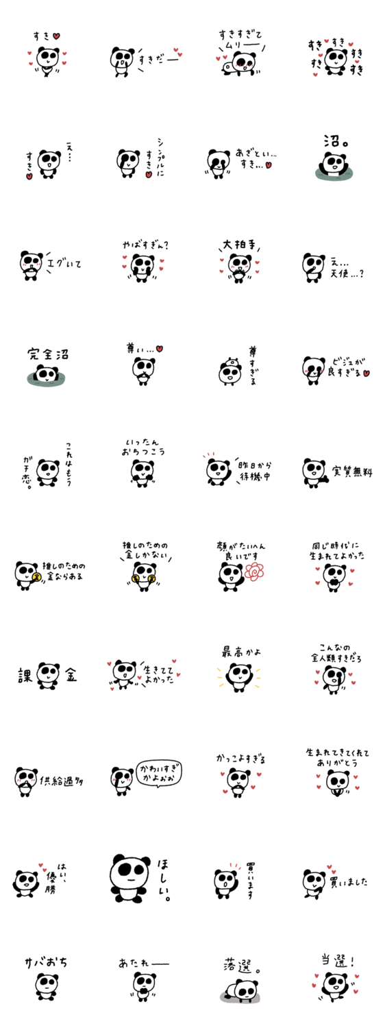 | スタンプ説明 | 私の名前はパンダです。 もっとゆっくりいきましょう。 子供の落書きのようなゆるいスタンプです。 シンプル/ゆる/シュール/パンダ/推し |