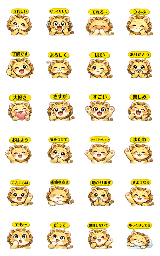 | スタンプ説明 | 大好き・うれしい・びっくりなど感情がすぐ伝わる、ちびライオンのリアクションスタンプです。 日常会話に使いやすい24個セット。 |