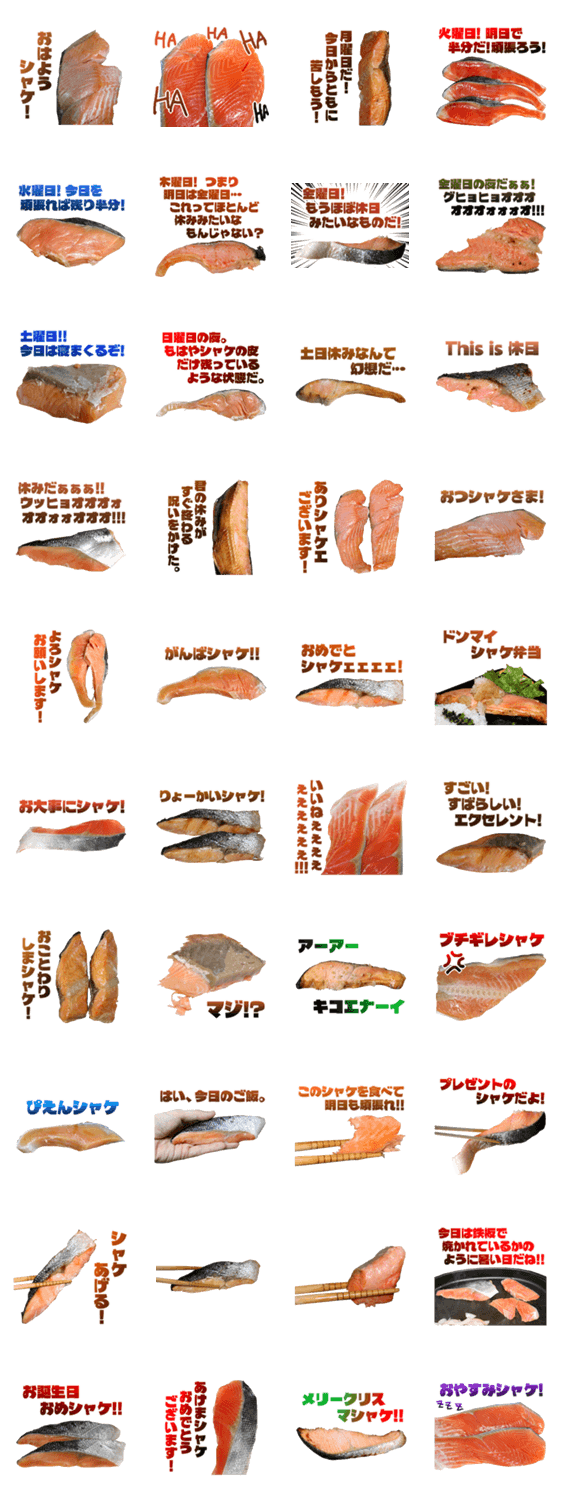 | スタンプ説明 | 鮭の切り身の、一年中毎日使えるスタンプです。一週間通して使えます。しゃけ、シャケ、焼き魚、魚介類、サーモン、便利、サラリーマン、仕事。実写食べ物スタンプシリーズ |