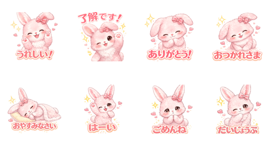 | スタンプ説明 | ふんわりやさしいうさぎの、毎日使えるスタンプです。 「ありがとう」「了解です」など、 日常会話で使いやすい言葉を集めました。 かわいく気持ちを伝えられます。 |