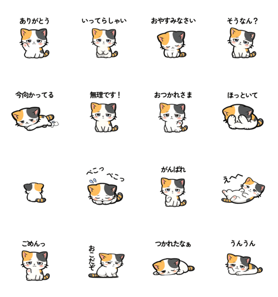 ゆるっとした三毛猫の、普段使いしやすい日常スタンプです。